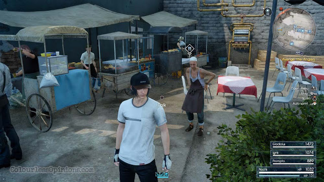 | The character, Noctis, buying Satay at a stall in Lestallum |
